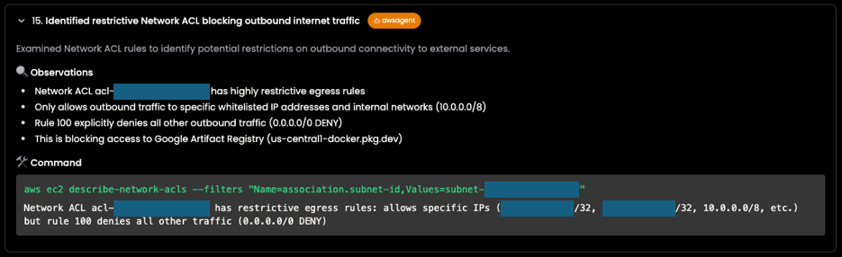 During these checks, the awsagent discovered that a network ACL had overly restrictive egress rules, allowing outbound traffic only to allowlisted IPs and internal networks (10.0.0.0/8). A default “deny all” rule (0.0.0.0/0 DENY) blocked all other traffic — including access to the container registry. This configuration prevented the new pod from pulling its image, explaining the ImagePullBackOff state.